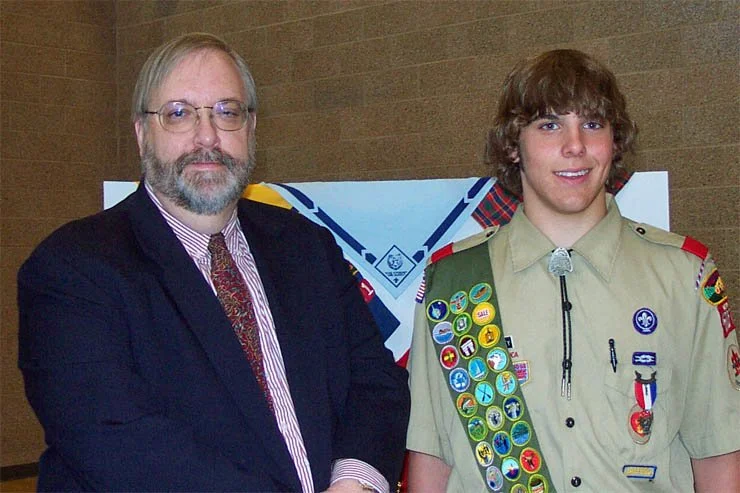Chapter Member and former ILSSAR President David Bailey proudly stands by his son Paul Donald Bailey III at the ceremony where Paul became an Eagle Scout. Chapter President Don Parrish presented a SAR Eagle Scout Recognition Certificate to Paul during the event.