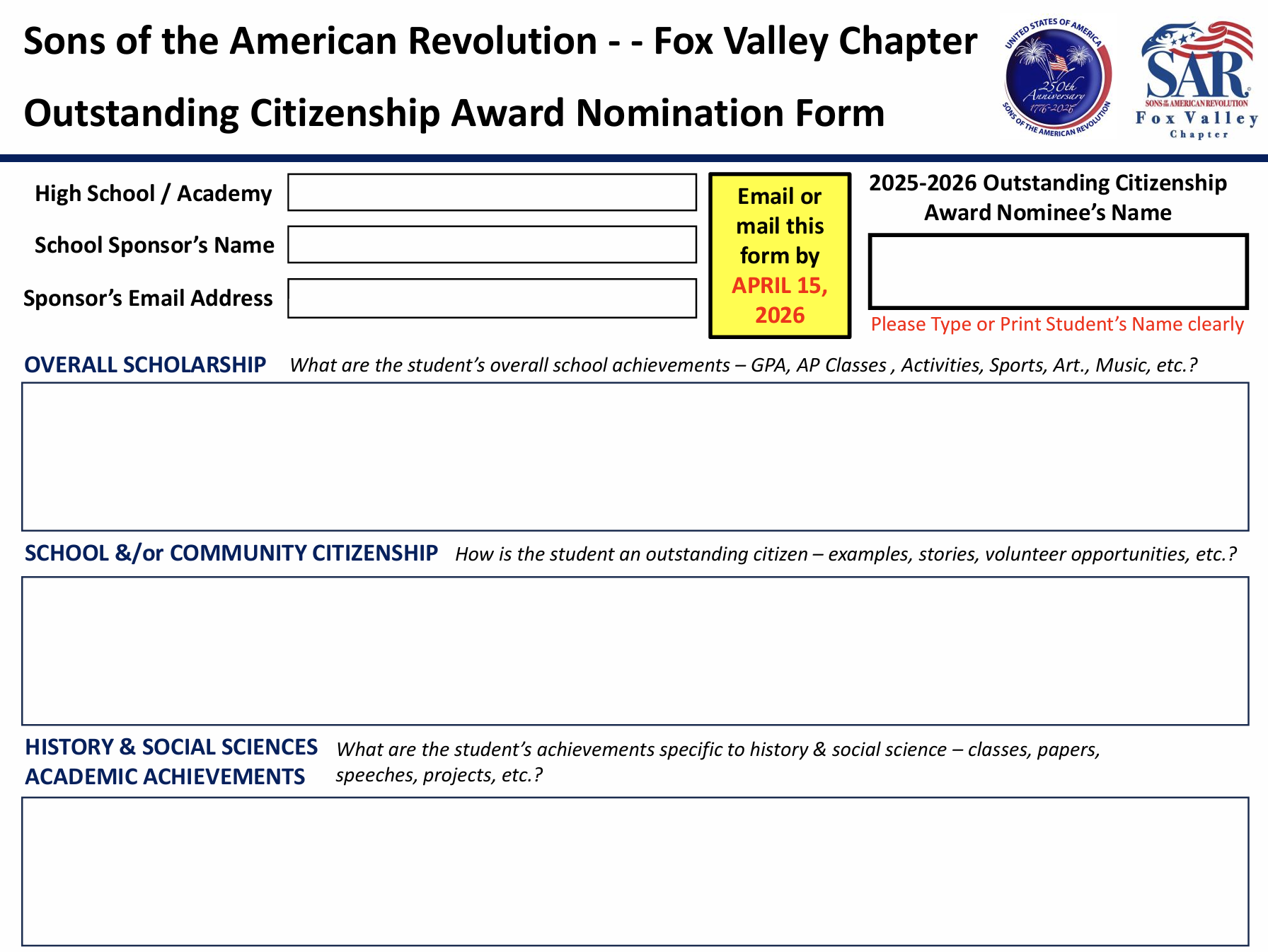 A Fox Valley SAR chapter committee will review all nominations received and decide upon a winner.